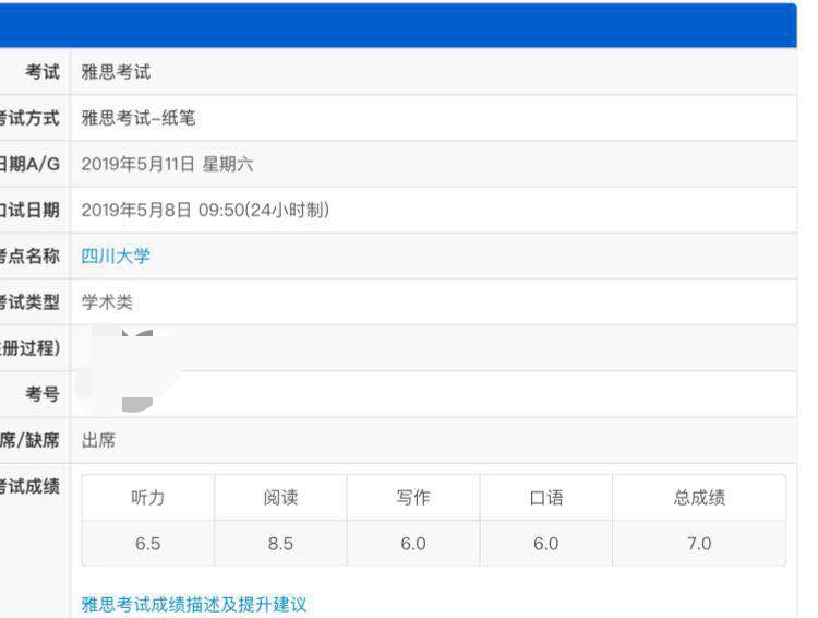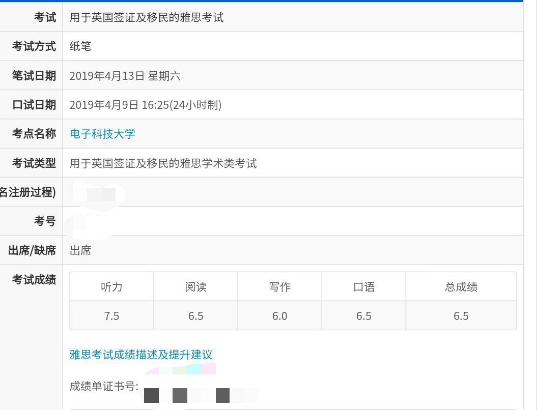 入学测评总分数:6分 提升分数:听力提升1.5分,阅读提升0.5分,写作提升1分,口语提升0.5分,总分提升1分。 考试时间:2019年4月13日参加雅思考试 录取大学:温莎大学