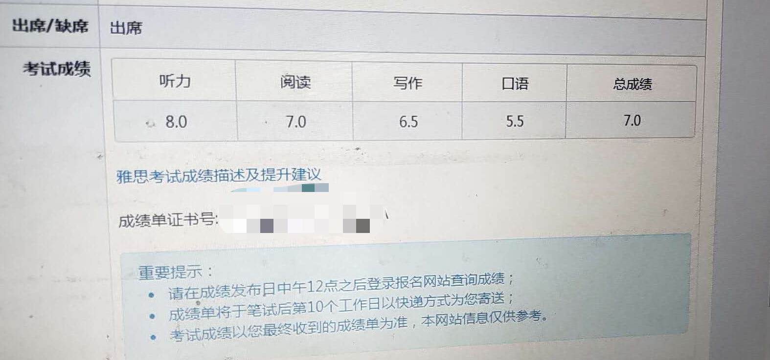 入学测评总分:6分 提升分数:总分提升1分。听力提升1分,阅读提升1.5分,口语提升1分,写作提升0.5分。 考试时间:2019年4月27日 录取大学:阿德莱德大学
